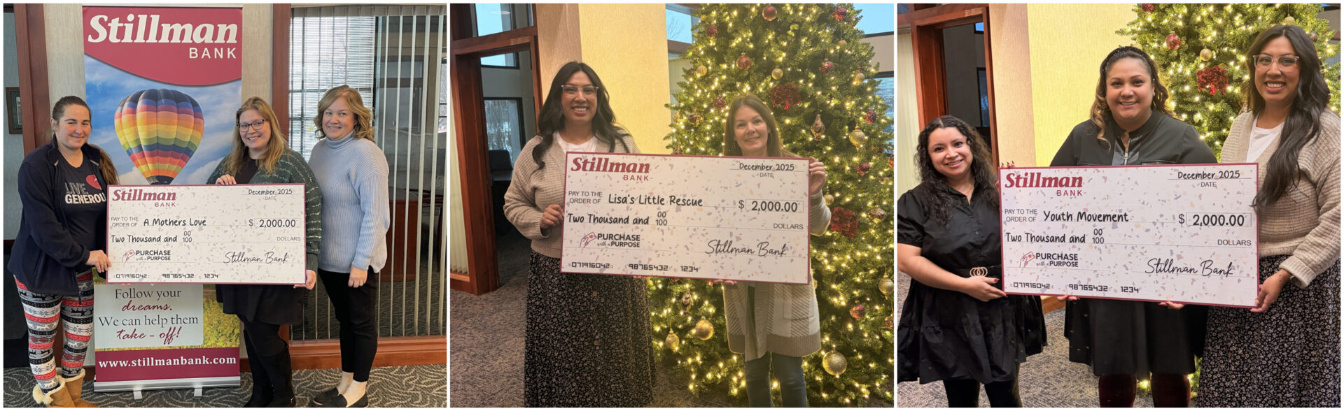 In November, we held our sixth “Purchase with a Purpose” Debit Card Campaign in which a $1.00 donation was made to local charities with every Stillman Bank Debit Card transaction up to $6,000! We were excited to be able to present checks for $2,000 to 3 non-profit organizations throughout the Rock River Valley: A Mothers Love, Lisa’s Little Rescue, and Youth Movement.